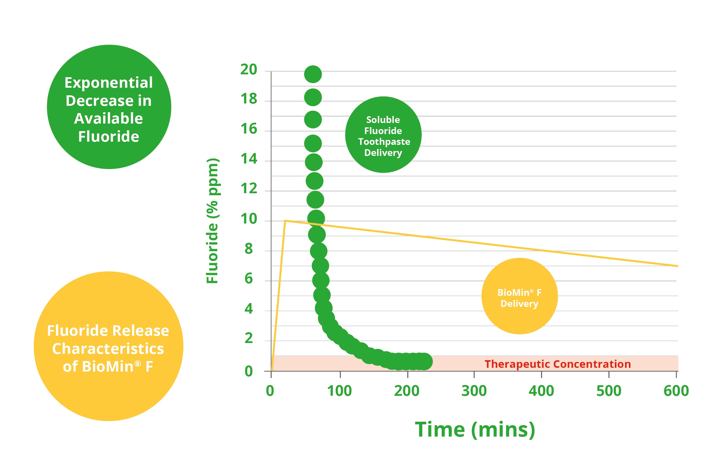 A imagem abaixo mostra a diminuição do flĂşor solĂşvel (pontos azuis claros) ao longo do tempo. Comparado Ă liberação de flĂşor do creme dental BioMin® F no mesmo perĂodo (linha verde).